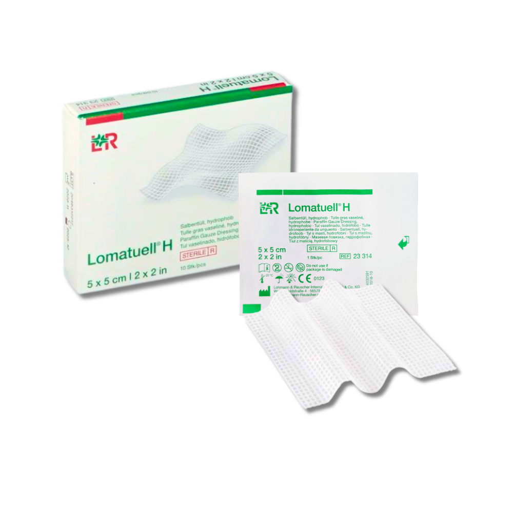 O Lomatuell® H 5cm x 5cm é um curativo de gaze parafinada hidrofóbico, pronto para uso, desenvolvido especialmente para o cuidado delicado de feridas superficiais. Saturado com vaselina branca, cria uma barreira protetora que reduz o risco de aderência ao leito da ferida, facilita trocas atraumáticas e contribui para o processo natural de cicatrização.
