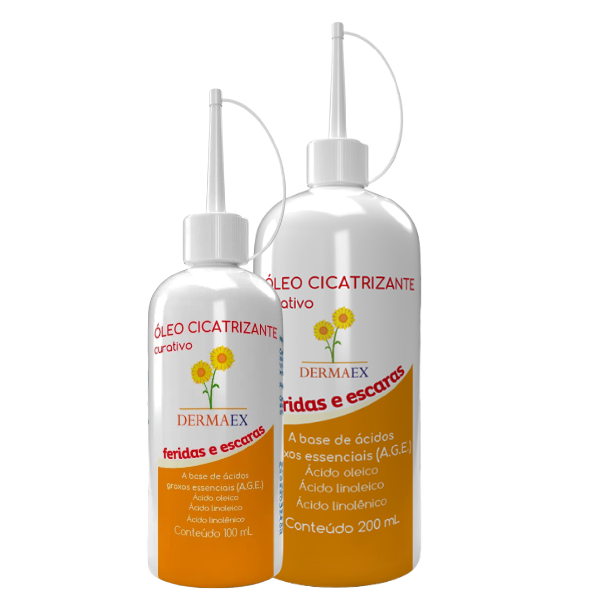 O Óleo Cicatrizante Curativo Dermaex é formulado com ácidos graxos essenciais (AGE) e triglicérides de cadeia média (TCM), além de componentes como óleo de girassol, vitaminas A e E, ácido linolênico, lecitina e óleo de soja. Sua ação favorece a hidratação da pele e a nutrição tecidual, formando uma película protetora que é impermeável à água e permeável aos gases. Essa barreira auxilia na prevenção de infecções, promove proteção contra agressões externas e cria um ambiente ideal de umidade e temperatura para acelerar a cicatrização.